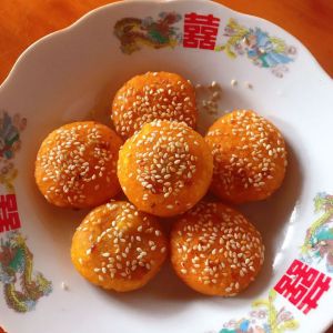 一小块面团压扁放入适量豆沙,跟包包子一样收口,搓圆放在芝麻上压扁(注意不要沾太多芝麻,不然后面煎炸很容易糊)