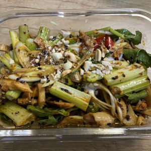 将大葱切薄片,芹菜切段,小米椒、蒜、姜切末