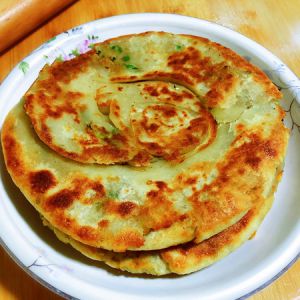 锅里放比烤其他煎饼时要多些的油,这样烤出的葱油饼才不会干硬并且外脆里软,葱香味更浓厚。