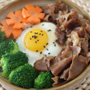 米饭铺在碗底,上面覆盖上所有菜品,一碗好吃的肥牛饭就做好了。