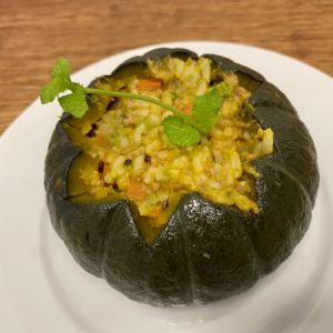南瓜整个蒸熟,取出晾凉后进行切割,挖出南瓜籽后挖出南瓜肉备用;牛里脊剁碎用淀粉和生姜腌制10分钟左右;西兰花胡萝卜焯水后捞出剁碎备用。(蔬菜肉都可以替换哈)