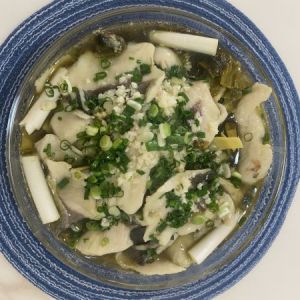 鱼片煮至颜色变白之后,连汤一起倒入装鱼头的碗中。