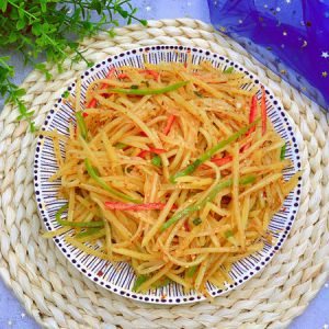 锅中烧开水,放土豆丝焯水,捞出过凉水,沥干水分放入碗中