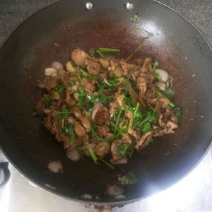 加入香菜后继续翻炒,待香菜断生变软后盛出即可。
