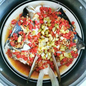 蒸锅里放水,大火烧开后放上鱼头,大火蒸15分钟。再淋上热油洒上葱花,即可。