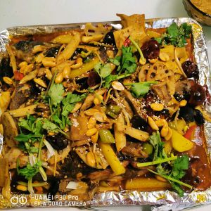 烤好出锅撒上白芝麻和黄飞红花生米,香菜,慢端到饭桌,即可吃了,就这米饭吃非常香哈!