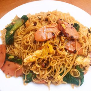 把面饼煮到八成熟捞出。锅内放油打入鸡蛋炒好后放入青菜翻炒2下在放入火腿肠翻炒,关小火放入煮好的面,放酱油和老干妈油辣子用筷子搅拌均匀出锅。