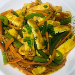 煎好的豆腐切条,胡萝卜青椒切条备用