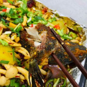 热锅少油,放入干辣椒段,青花椒,姜蒜花椒爆香,放入豆瓣酱炒出红油,这步忘了拍照。炒出红油后,放入水烧开,放生抽,糖调味。再把配菜放入煮熟,再盛出倒进烤好的鱼身上