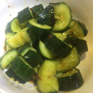 用刀面拍黄瓜 直至有裂纹 然后切好放入碗中