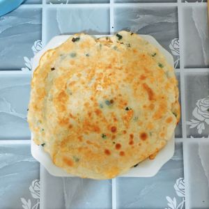 用擀面杖擀成薄面皮,刷一层冷却后的加热过的,撒上葱花和适量盐