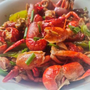 3、热锅下油,油热后,倒入一半配料,再倒入小龙虾翻炒,再把所有配料都倒入,翻炒。撒盐,倒酱油,撒少许干辣椒,花椒,鸡精,翻炒,倒点水或者酒,装盘,起锅。