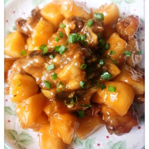 把肉和土豆倒入锅中,快速翻炒,迅速装盘。