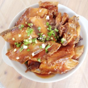 最后用2:1的糖醋加淀粉和酱油调个黏稠的汁淋上………撒点小葱即可