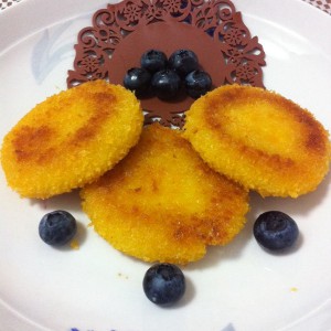 鸡蛋打散,将南瓜饼在蛋液里滚一圈