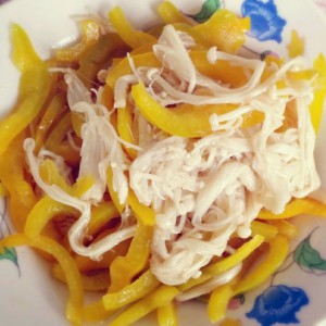 将金针菇和黄椒放入热水煮30秒,时间长了,会塞牙呦