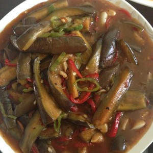 调汁(淀粉,盐,一点点点鸡精和味精,酱油,根据个人口味放醋(一般小汤勺一勺半),加一大碗水搅拌均匀)茄子切条~锅中放油烧热,放入花椒出味捞出,大量蒜末,葱末,灯笼椒丝,小勺豆瓣酱炒香~放入茄子翻炒至变色~加入调好的汁~