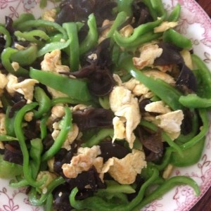先下鸡蛋,用油煎一会,用铲子切成块,鸡蛋熟后放青椒丝、木耳炒熟,最后放入适量盐。完成啦!出锅!