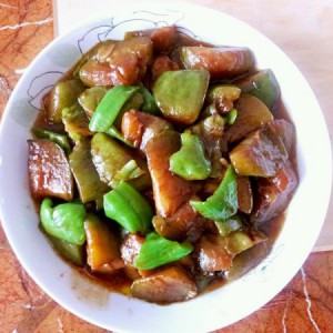 锅内重新倒入少许油,将切好的葱蒜入锅爆香,将调好的汁倒入锅内,然后将之前炸好的茄子放入锅中翻炒,待茄身沾满调汁,将切好备用的青椒放入锅中,翻炒几下即可出锅(第一次尝试做,但味道家人说还不错)
