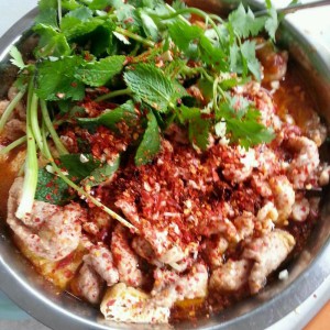 煮好的肉片倒入装着陪菜的盘子子里,把炸好的干辣椒和花椒油淋再上面,撒上蒜沫 干辣椒面 白芝麻在放点香菜薄荷叶在旁边。