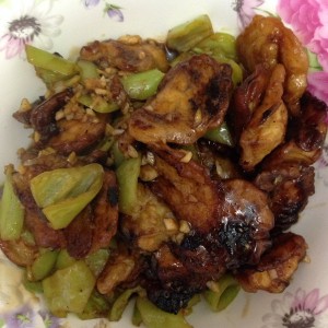 8、酱汁翻炒好后倒入煎炸好的茄子块迅速翻炒几下让每块儿茄子都挂上酱汁即可出锅(注意这个步骤一定要快)