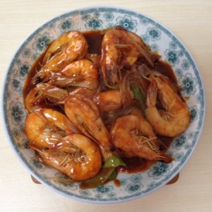 添加适量油继续下大葱段爆香,倒入调味汁,下入煎好的虾翻匀,加少许盐,小火盖盖焖2分钟,中火收汁。