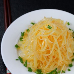 捞出的土豆丝马上冲凉,放入事先准备好的冰水里浸泡一下滤干水分备用;