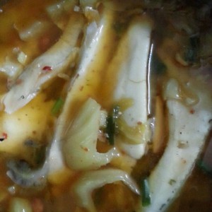 锅内入油,烧热放蒜,一点点红椒,爆香,淋在酸菜鱼里(喜欢吃辣的放多点红椒)