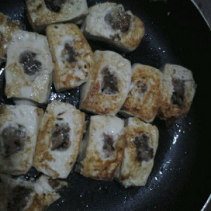 酿好以后,把豆腐放入锅内码好,洒点盐开始煎