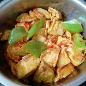 葱姜蒜爆炒,加入切好的西红柿和盐炒成汁加入炸好的茄子和切好的青椒