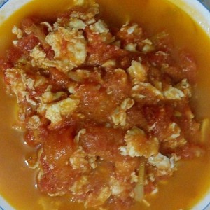 油加热放入切好的大葱爆锅,西红柿入锅炒,一半成酱状时放入淀粉(用来收汁,千万不能多,不然很难吃),把炒好的鸡蛋入锅,一起炒。依次加入辅料,最后出锅装盘。