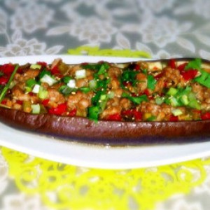 茄子划花刀,便于入味,涂抹少于盐;辣椒葱蒜剁成末,放入碗中,加入盐和酱油;瘦肉剁成肉泥加入料酒和酱油,腌制一会儿。