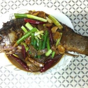 待汤剩一半的时候开盖 放入白糖适量 老抽少许 味精少许 前后晃动锅(便于汤能入味到鱼的朝上面)待汤收妥 盛出鱼 将小葱切段放至鱼表明 将汤汁淋在小葱上 完成