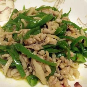 倒入腌制的肉丝,转中火翻炒,无血色之后加少量生抽,然后放青椒丝。
