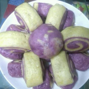 紫薯同红薯,10分钟后,分别取面团擀皮,迭起,再卷成5厘米粗的条状,用刀切。