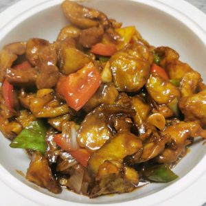 倒入炸好的茄子肉块青红椒,翻拌均匀。