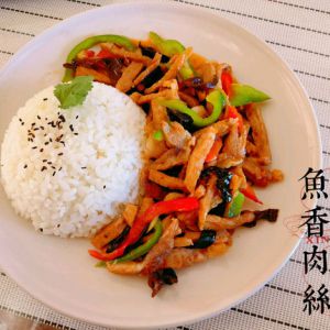 葱姜蒜末花椒炝锅,少许冰糖炒化,翻炒肉丝上色,然后倒入调好的汁,倒入蔬菜丝搅拌均匀。