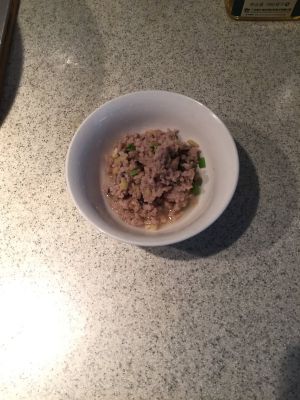 把肉末、姜、香菇倒入锅内加入盐、葱、酒翻炒均匀