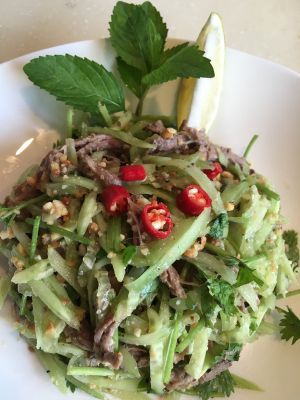 手撕牛肉放黑胡椒,盐,黄瓜丝,香菜丝