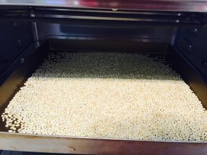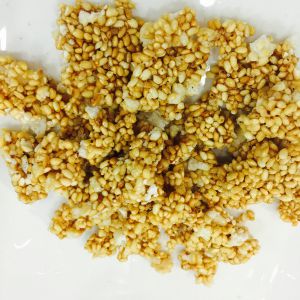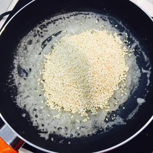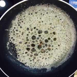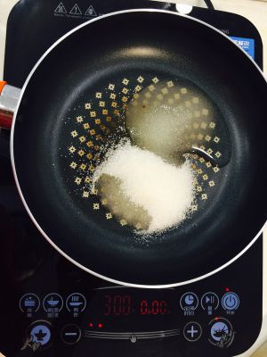 将水和细砂糖放入不沾煎锅中,小火300瓦