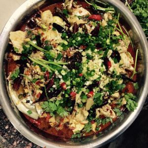 加入原先已炒香的花椒、干辣椒、生蒜末、葱末、香菜,浇上热油,大功告成!