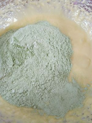 先加入一半的抹茶面粉混合物,翻拌至看不到干粉