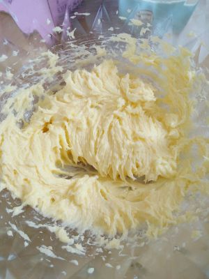 室温软化的奶酪、黄油,先用电动打蛋器打散,然后加入细砂糖,搅打均匀~