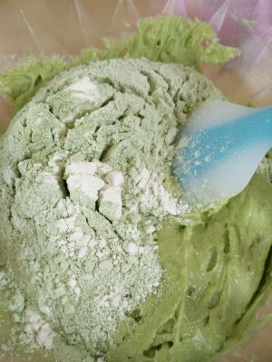 然后加入剩下的抹茶面粉混合物,翻拌至看不到干粉