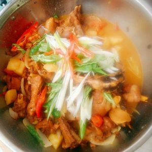 十分钟左右放入手擀粉,翻炒几下,放入青椒、大葱,放点鸡精,就可以出锅喽!
