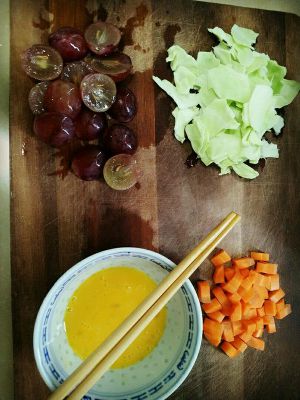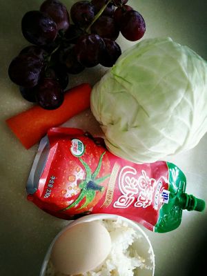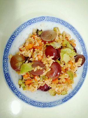 先炒菜和胡萝卜至半熟,再加饭,翻炒5分钟,再加番茄酱至所有饭都变成红色,再加红提,过2分钟后关火。