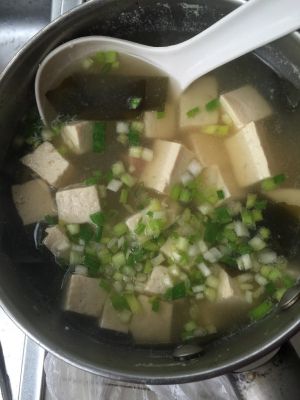 海带和豆腐放入锅中煮,如果有高汤味道更好,如果没有可以用浓缩高汤汁调味。