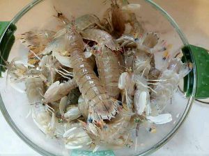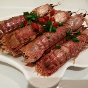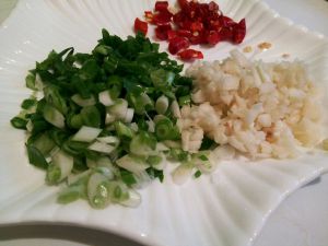 锅里放油,把蒜泥,生姜,辣椒,炒香,可爱的皮皮虾就可以下锅炒了,炒一下变色,放料酒,盐,放一点点的热水,等到水差不多没有就可以起锅了,摆好的时候,可以撒点葱花点缀一下