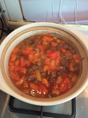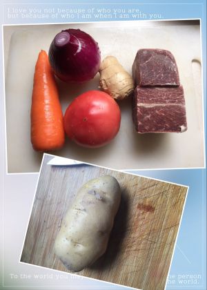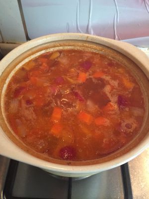 将翻炒后的胡萝卜和洋葱倒入砂锅,将土豆丁也倒入砂锅。加入适量的盐(根据个人口味调节)。小火炖半小时。美味出炉!