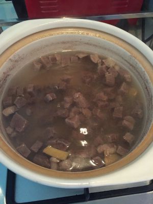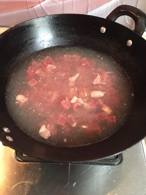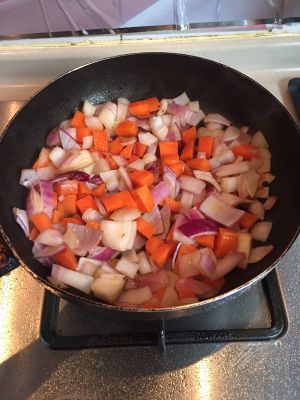 切成丁的胡萝卜和洋葱翻炒一下,倒入砂锅!